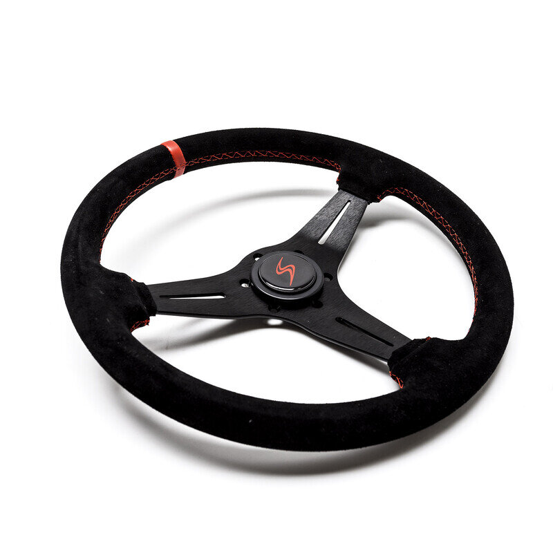 Volante da 350mm in pelle scamosciata con cuciture rosse.