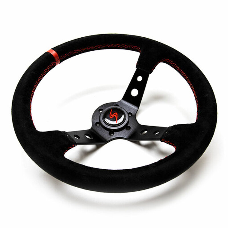 Volante da 350mm in pelle scamosciata con cuciture rosse.