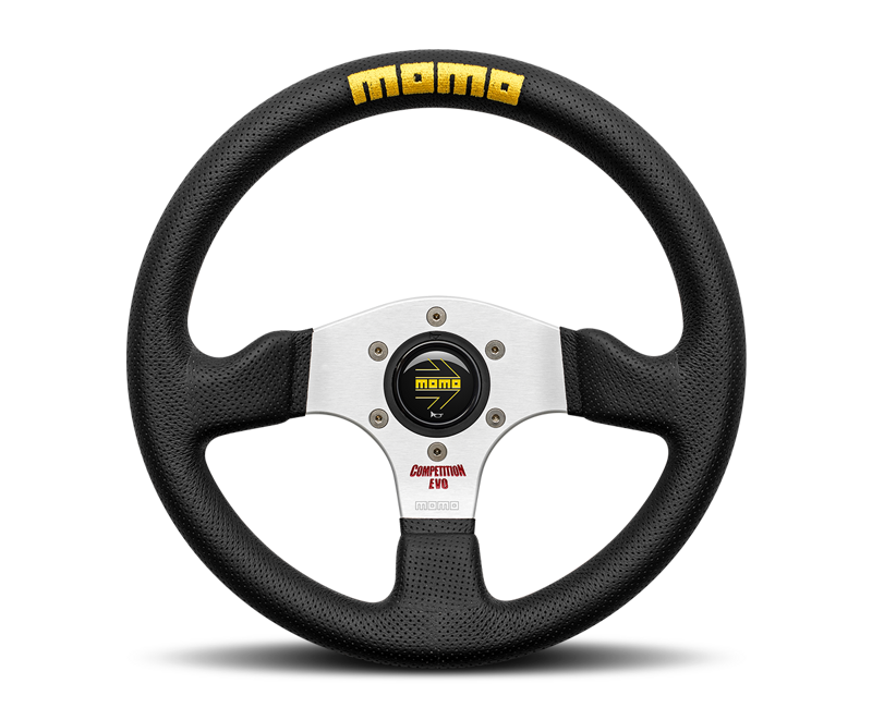 Pelle nera traforata, razze argento.Pulsante nero lucido. Ricamo Momo giallo.Logo “Competition Evo” rosso sulle razze