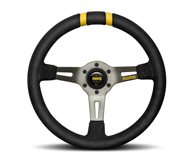 Impugnatura in pelle scamociata e caliciatura di ben 88 mm e diametro 330, consentono un ottimo controllo durante le manovre di drifting, gli inserti di colore giallo presenti nella parte superiore del volante forniscono al pilota la posizione delle ruote.