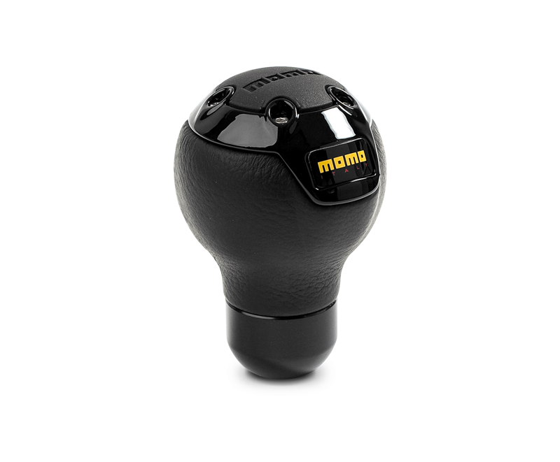 Pomello in pelle nera con inserti neri lucidi e calotta con logo momo in gomma.